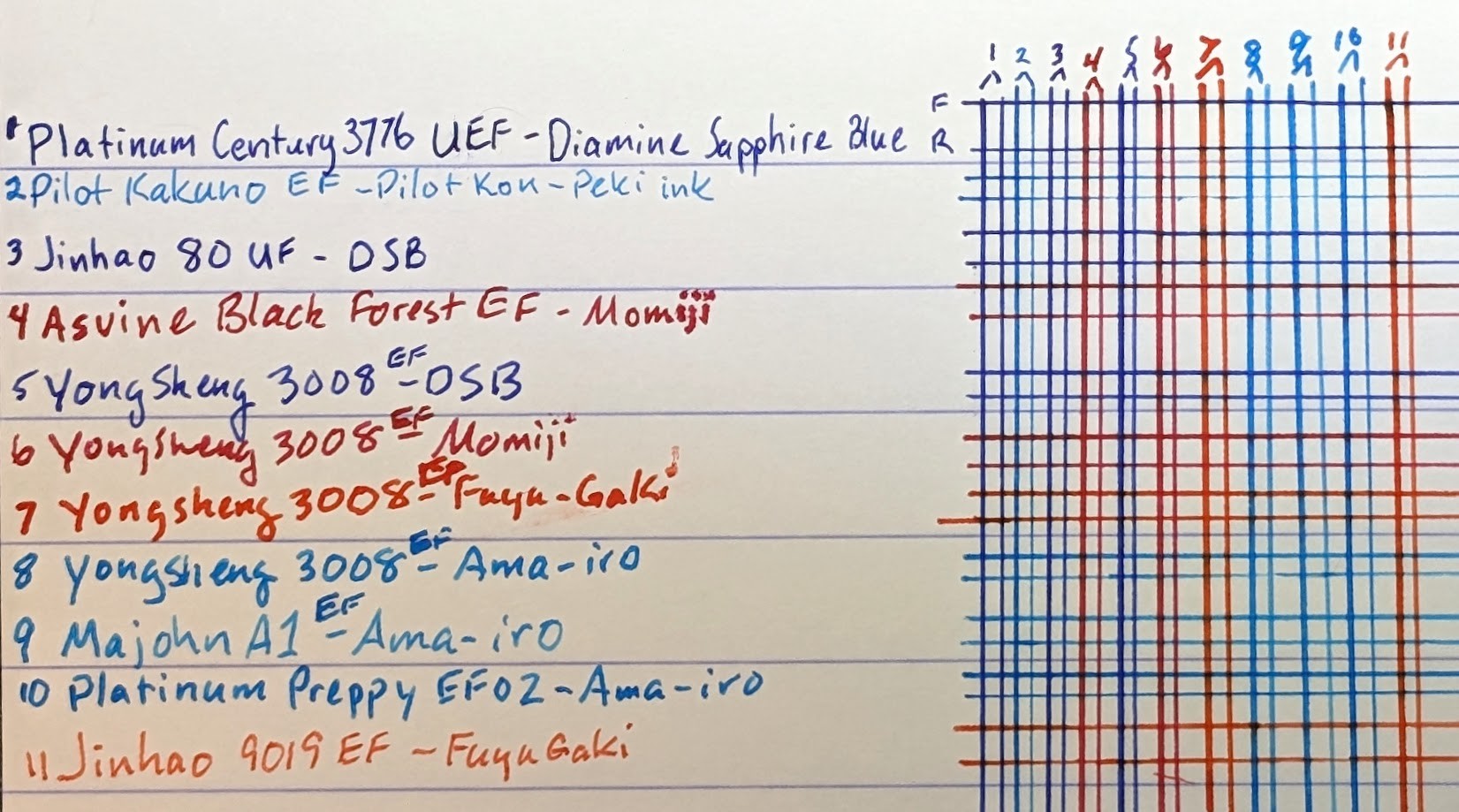Most interesting new bit is that I grabbed a four pack of cheap Yongsheng 3008 EF which makes it possible to see the difference between inks in the "same" pen.