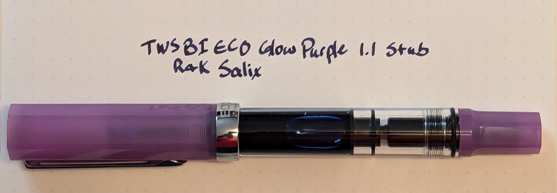 I paired up a new TWSBI ECO Glow Purple and Rohrer & Klingner Salix. It's the first (and maybe only) iron gall ink I've tried and I figured a color changing ink would pair well with a color changing pen.