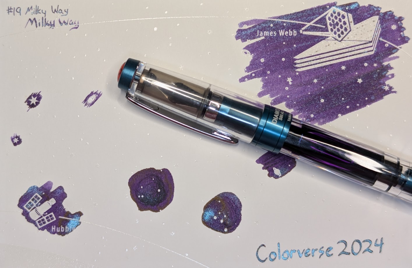 Colorverse Colorvent 2024 Day 19 is "Milky Way (Glistening)", a purple ink packed with teal shimmer. Less dense areas are dark purple, shaded areas even darker and full of shimmer. There is a tiny bit of gold(?) sheen, but it's hard to see.