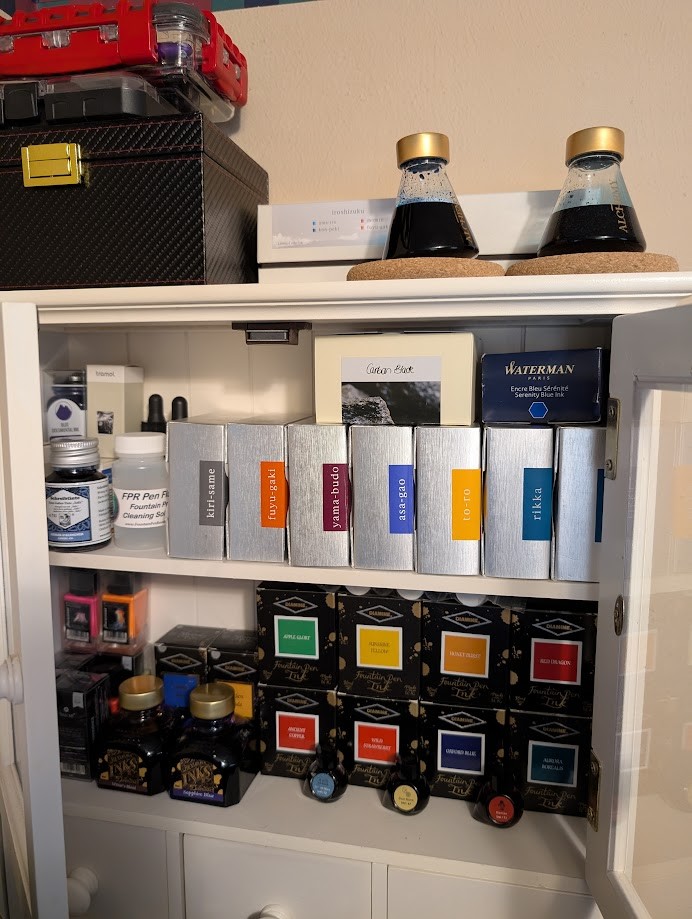 Still figuring out how I want to arrange things. Might take the Pilot inks out of the boxes so they don't need to be on their sides.