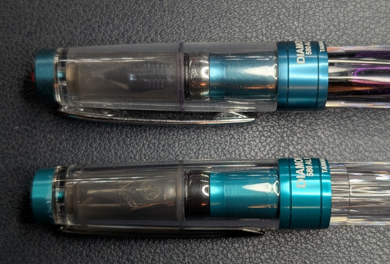 Turns out the Caribbean Onyx TWSBI Diamond 580ALR is quite close to the Prussian Blue. The CO is a skosh more green, the PB a smidge more blue, but not by a huge margin. The accents, including the nib, are darker/different as well. I like both, just expected a little more distinction, since it looked more green/teal in other photos.