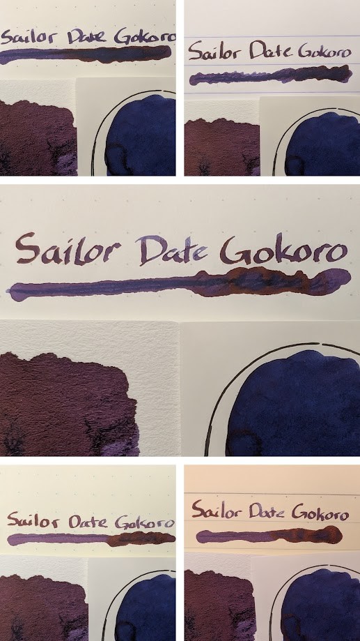 - Center: Tomoe River S Kanso. Writing is mixed, some areas more blue, shaded areas more red. Blob is more neutral overall, but a little more blue on left, red on right where more ink settled.