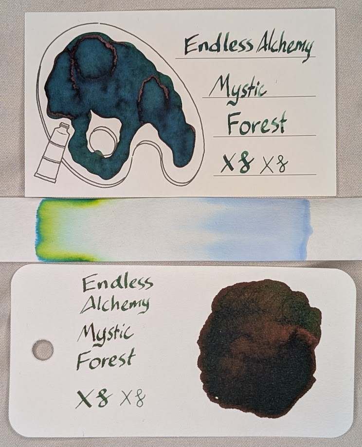 Endless Alchemy Mystic Forest is one of the few greens I have and I rather like it. It's a nice dark green, sort of hunter green adjacent with just a hint of coppery sheen. This one is very well-behaved and I haven't had any issues with it in any pen I've used it with over the past year.