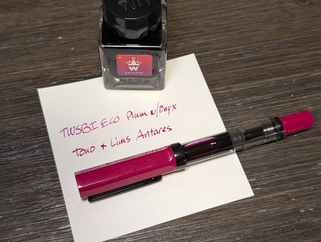 Inked up my new TWSBI ECO Plum w/Onyx with Tono & Lims - Antares, another one of their very usable fluorescent inks in the Star Light Series. I hope they make even more of these! The three I've tried so far have been great. Hoping to have time for a proper swatch this weekend.
