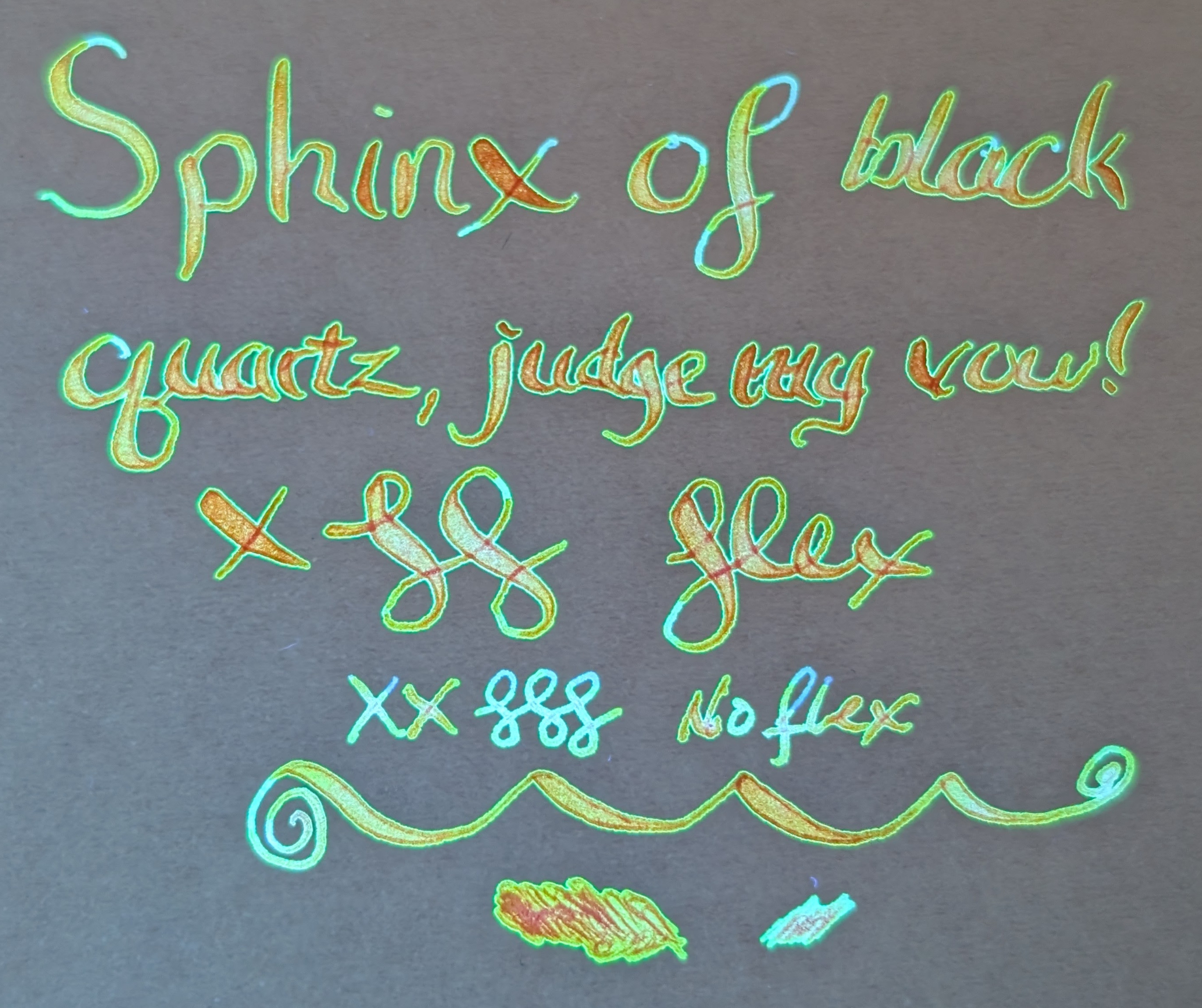 Because of the way it was behaving I thought I'd try a flex pen. It looks a lot more red-orange this way, but a darker shade of the same overall hue. Some of the larger parts of letters have some pink.