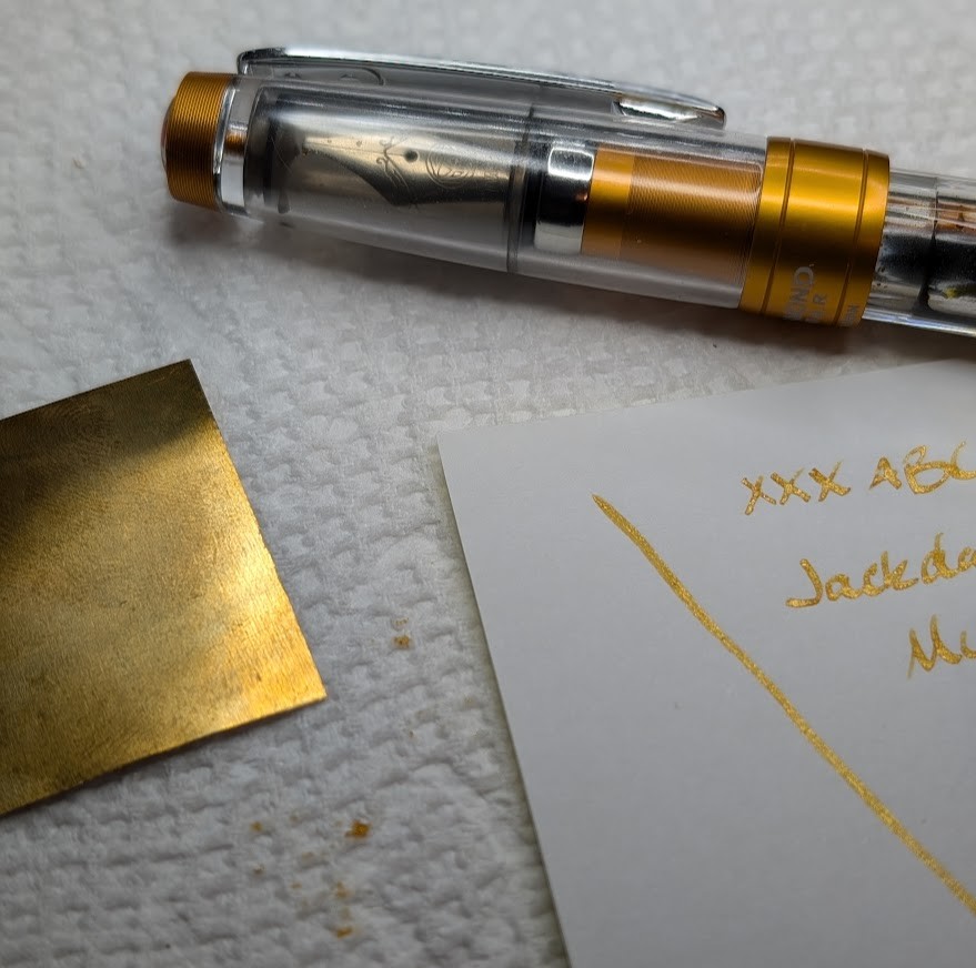 Good news and bad news. Bad news is I had my first shimmer ink clog (even in a TWSBI 580). Good news is a brass sheet saved the day. Quick swipe down the nib slit and another between the nib and feed and it's flowing freely again.