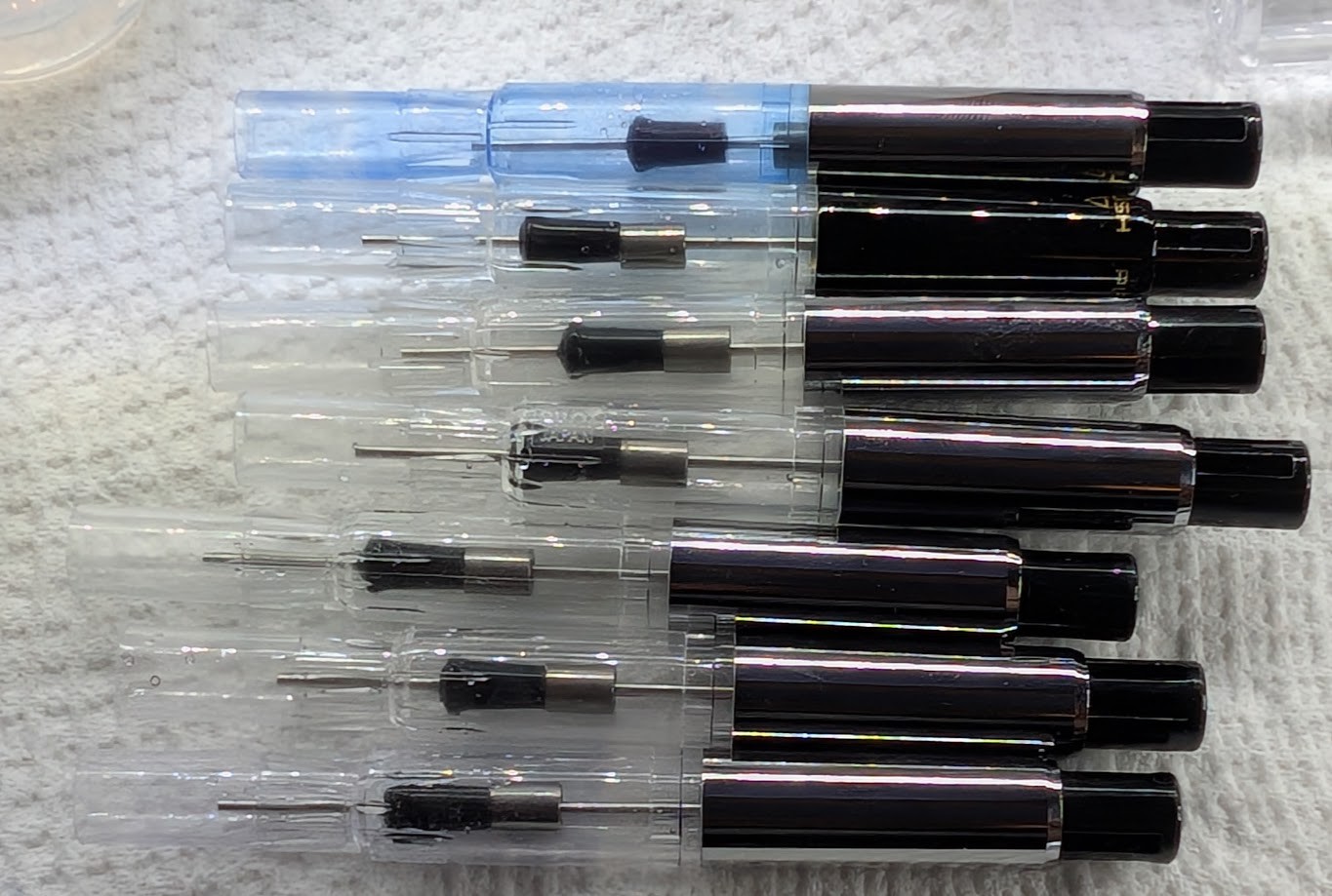 Cleaned some more pens at lunch, all of the Kakuno family. None of these were too bad, no clogs, but some stubborn ink in feeds that persisted after a lot of flushing. CON-70N is tricky to get completely clean, too.