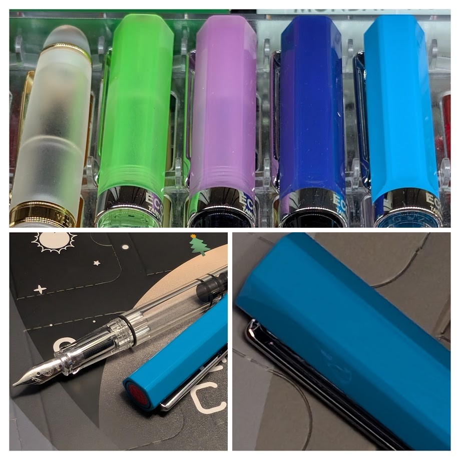 Three panel square photo of fountain pens. The top photo spans the entire width, beneath that are two square photos.  In the photo across the top are the caps of several fountain pens: Frosted clear, bright light green, purple, dark blue, and one that appears to be a light sky blue.  In the bottom left is the body of the pen, which is clear, the nib, which is silver, and the cap, which is still light blue but noticeably darker than the previous photo. In the background is a distinctly space-themed item with the letter "C" visible.  In the bottom right photo is another view of the cap, this time it's even darker.