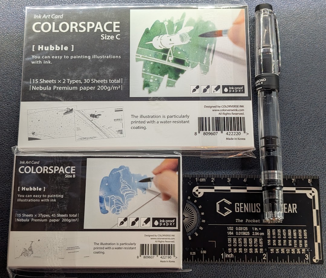 ![Photo of several items on a table. The first item is a packet of ink art cards. The card is in three sections, two at the top and one across the bottom. The top left section is text and reads (exactly) "Ink Art Card. Colorspace. Size C. [ Hubble ] You can easy to painting illustrations with ink. | 15 sheets x 2 types, 30 sheets total | Nebula Premium paper 200g/m^2 | -- The upper right is an image of the Hubble space telescope in negative space surrounded by a swatch of green ink and a brush lifted just off the page. Across the bottom are basic images of the swatch card types, one is a star field with both Hubble and James Webb telescopes. The second is a star field with some orbit lines and the Hubble telescope, then "The illustration is particularly painted with a water-resistant coating", and then some copyright text, a barcode, and "Made in Korea" The next item is a slightly smaller set of similar cards. The layout is similar. Top left reads the same as the first card except it says "Size B" and "15 Sheets x 3 Types, 45 Sheets Total". The image is of the "Mystic Mountain" section of the Carina Nebula in negative space surrounded by a swatch of blue ink and a brush. Next to the cards is a black TWSBI Diamond 580ALR fountain pen with no ink. To the bottom right is a rule card with a photogrammetric scale in centimeters.](/assets/images/ee550e553043946d.jpg)