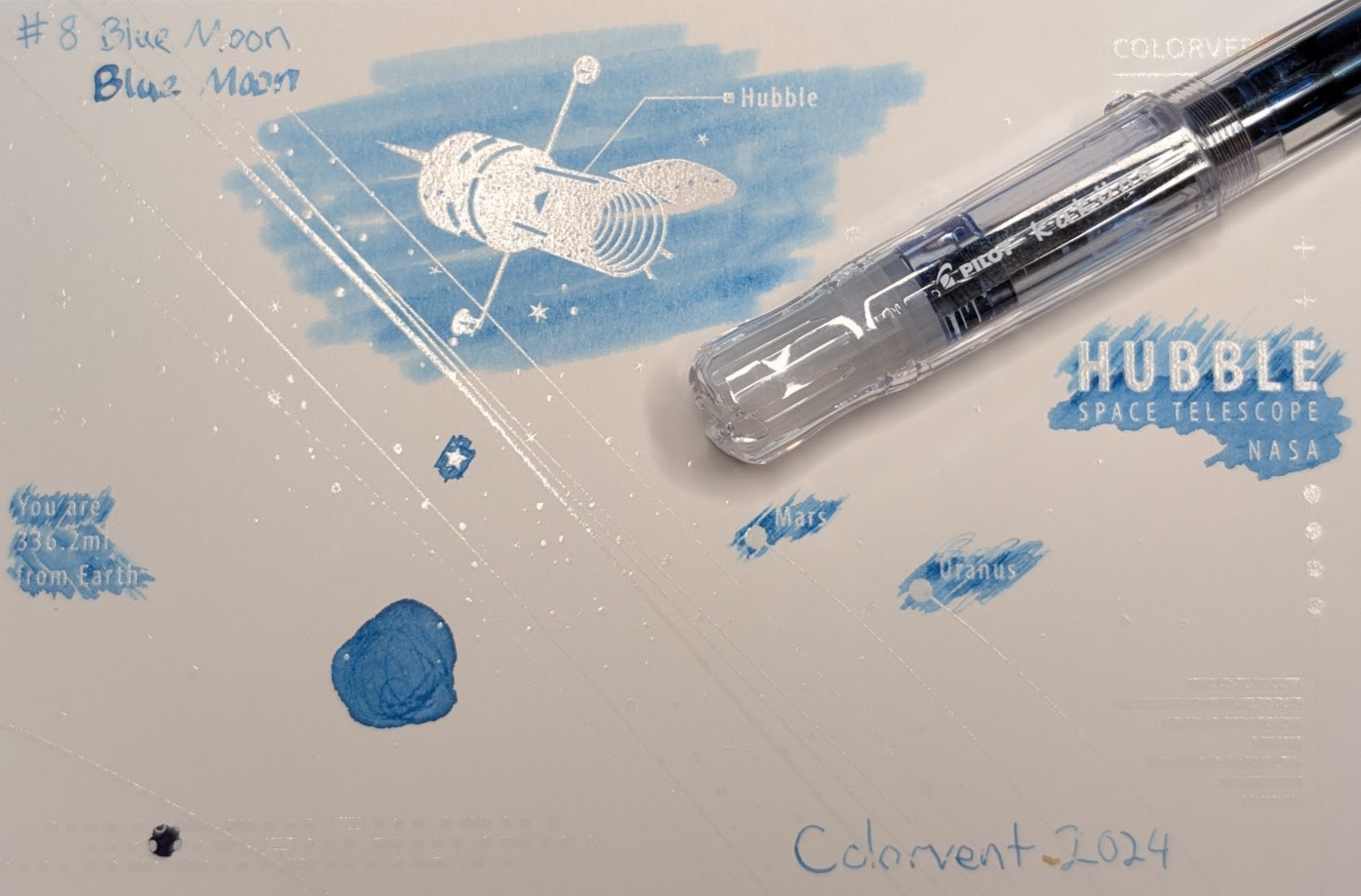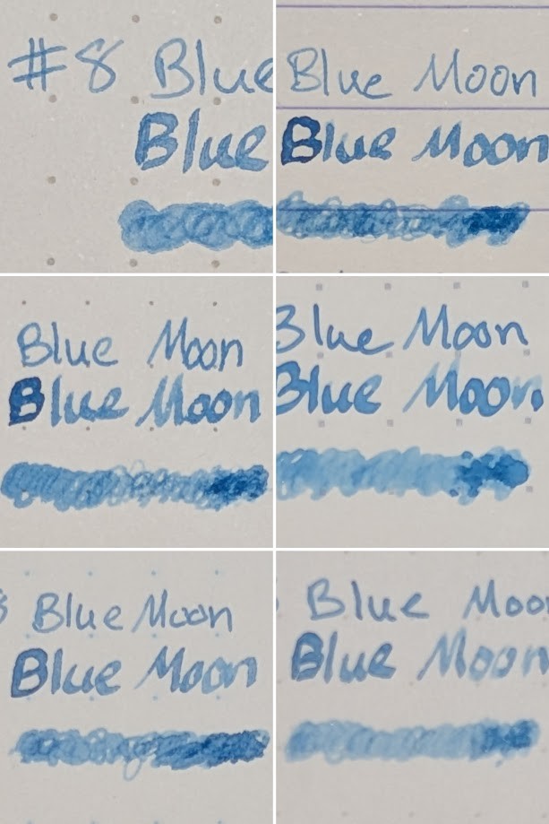 Colorverse Colorvent 2024 Day 8 is "Blue Moon", a light blue ink that runs wet and shades significantly. There is a tiny bit of purple sheen in deep pools.