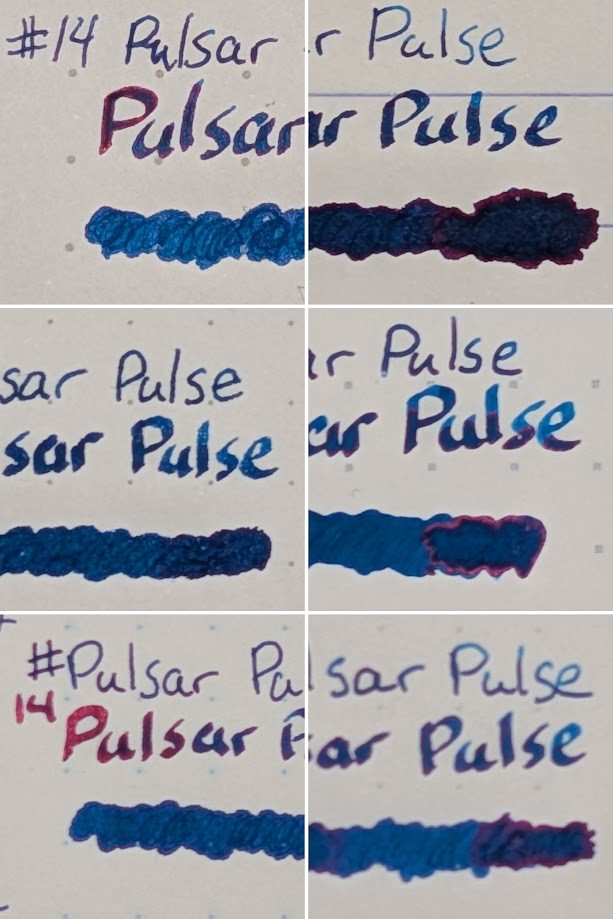 There are a lot of blue base + red sheen inks around, so it's not exactly a standout, but this sheens heavier than most (but still less than Endless Alchemy Candy Sea), and has a much lighter base color.