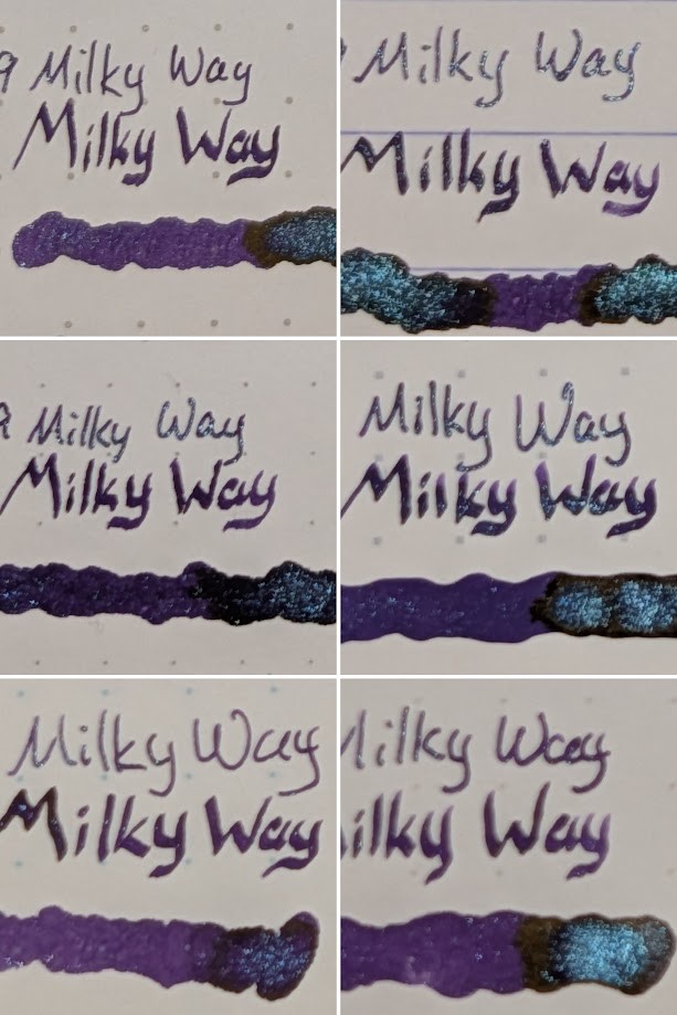 These videos were made using a fairly wet stub nib, a smaller nib or dryer nib may not be packed quite so dense. The dip pen writing had a lot of shimmer, but not this much, and more of the purple base was visible.