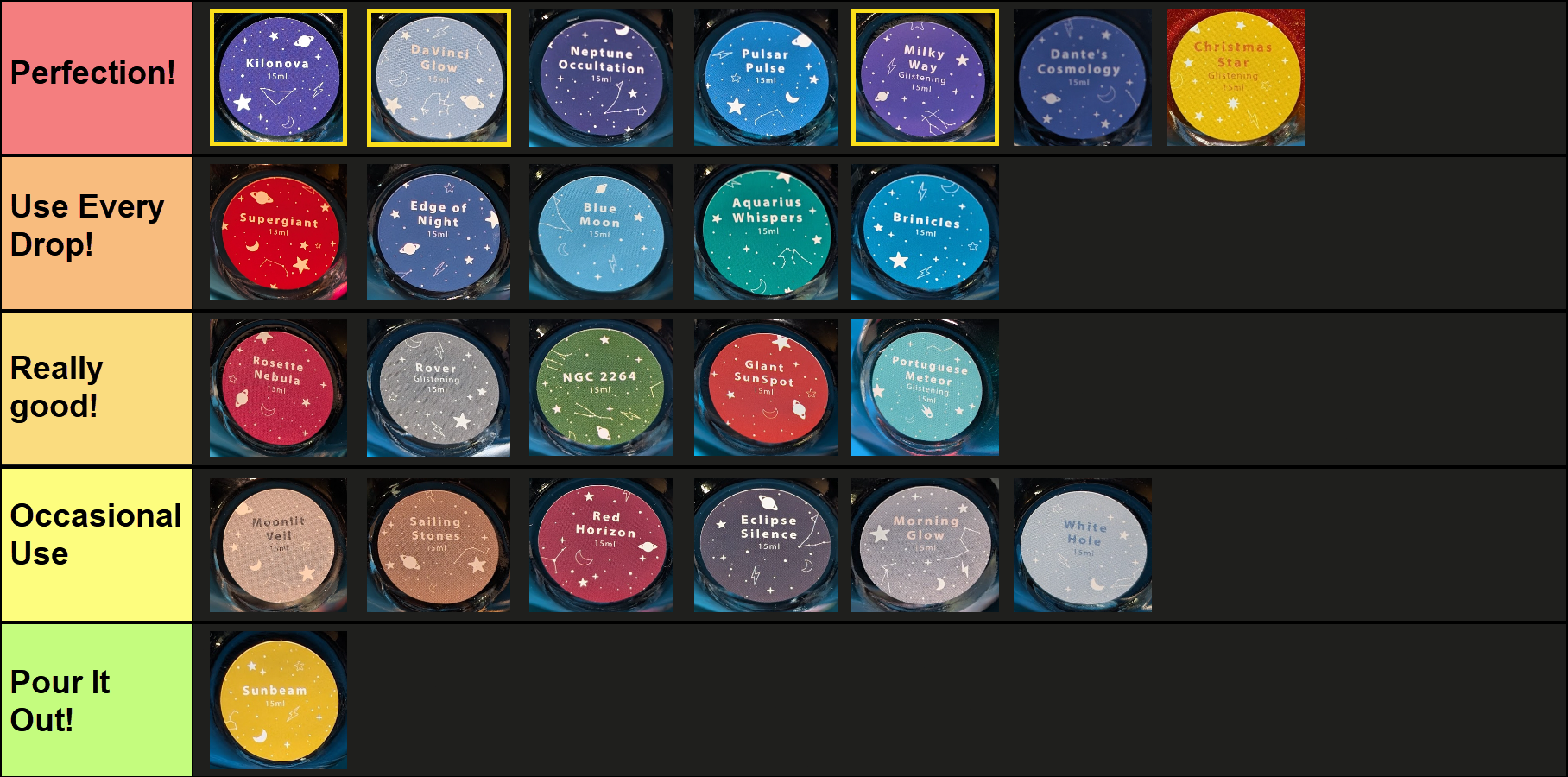 Mulled things over a bit and sorted this year's inks by how much I liked them and how frequently I could see myself using them. Note there is only one row that's actually negative, the others are only varying levels of greatness.