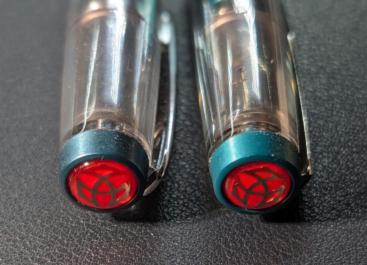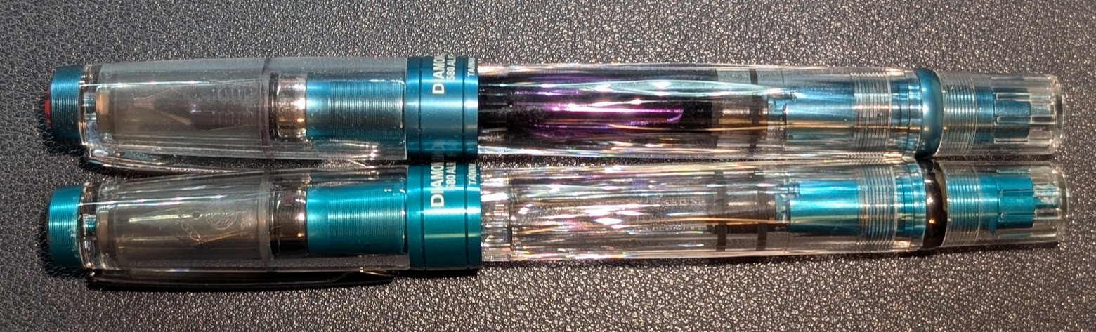 Turns out the Caribbean Onyx TWSBI Diamond 580ALR is quite close to the Prussian Blue. The CO is a skosh more green, the PB a smidge more blue, but not by a huge margin. The accents, including the nib, are darker/different as well. I like both, just expected a little more distinction, since it looked more green/teal in other photos.