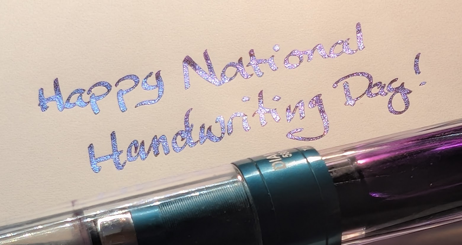 Photo of writing on paper with a fountain pen underneath. The writing reads "Happy National Handwriting Day!" in reflective and sparkling letteres that are Dark blue, light blue, and purple depending on how the light hits it.  The pen is a TWSBI Diamond 580ALR in Prussian Blue. Purple ink is visible through its transparent body.