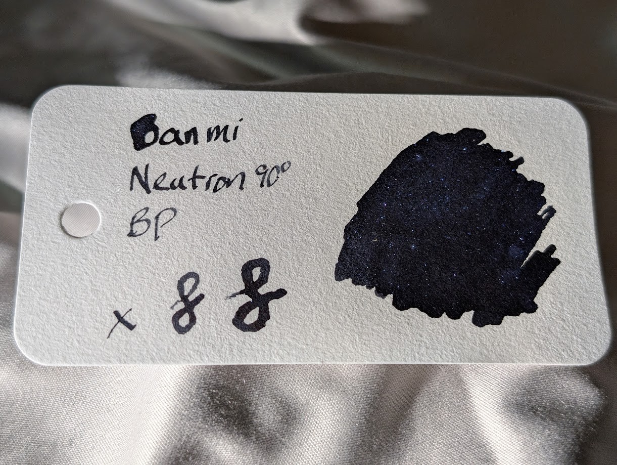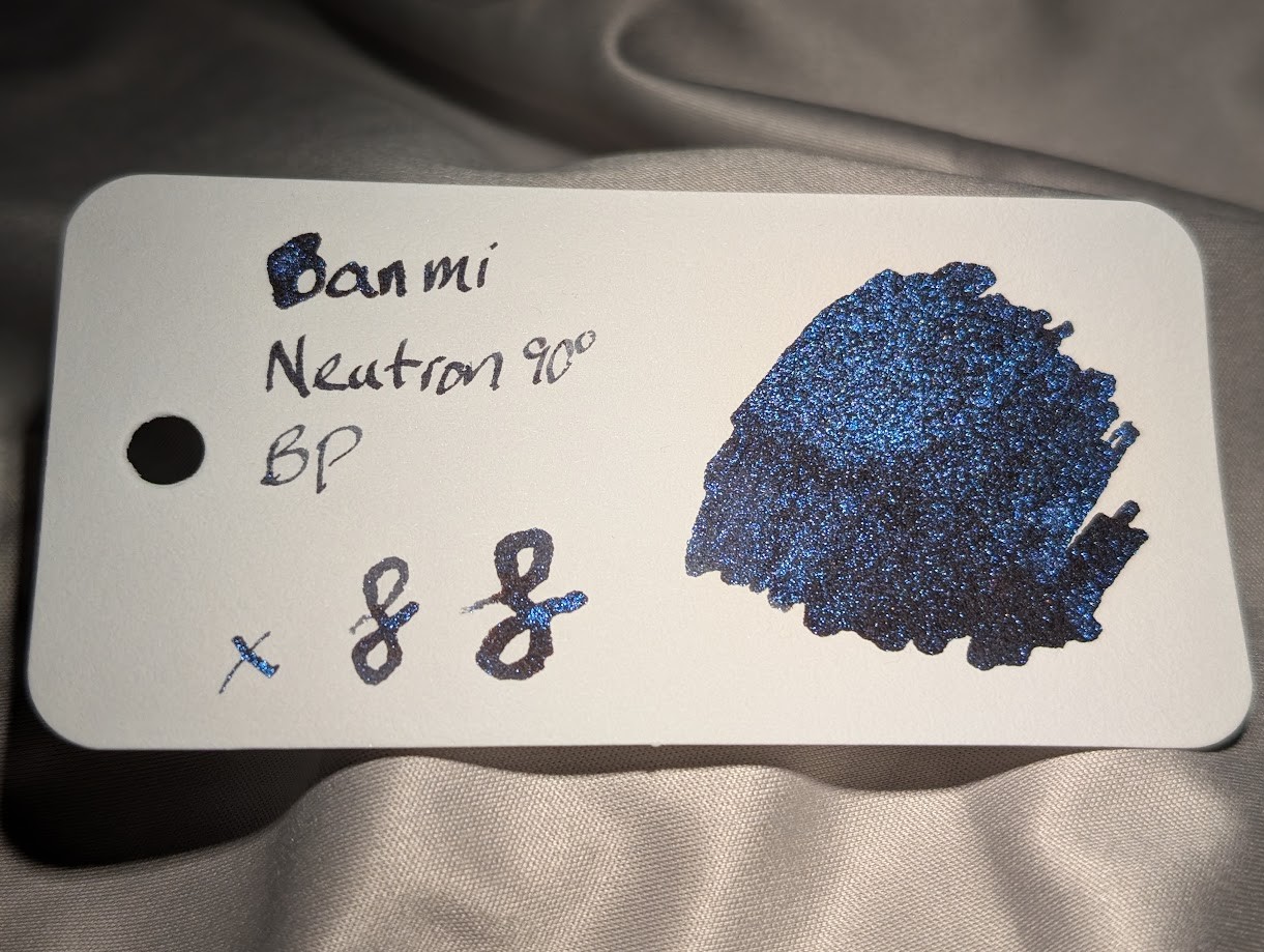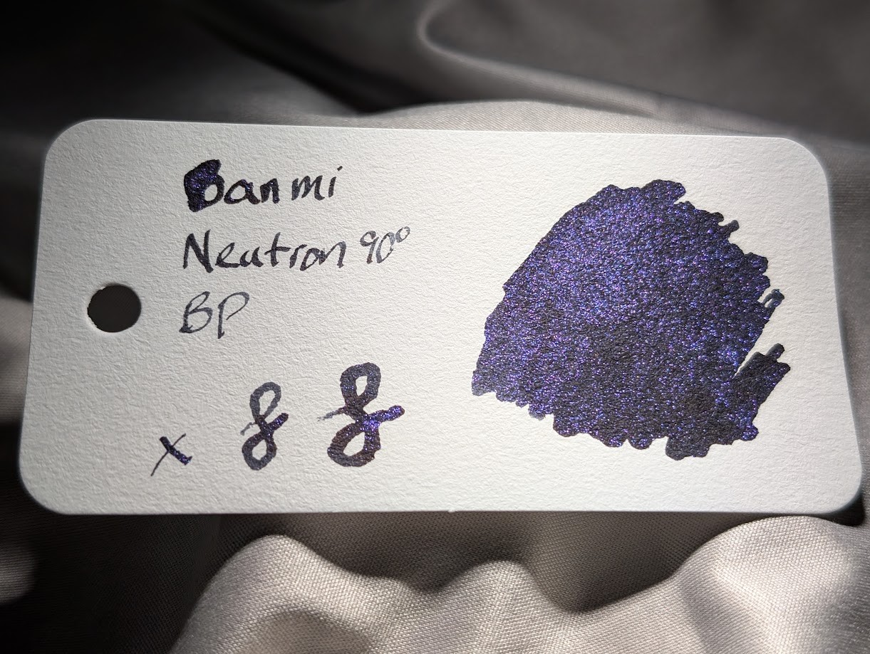 Continuing my trend toward "inks that do weird things", here is Banmi Neutron 90° BP (Blue & Purple). The ink itself is black, but it's crammed full of multi-color shimmer particles that shift from blue to purple depending on the angle of the light. Similar to Diamine's chameleon shimmers. There are two more of these, Green/Purple and Red/Green.