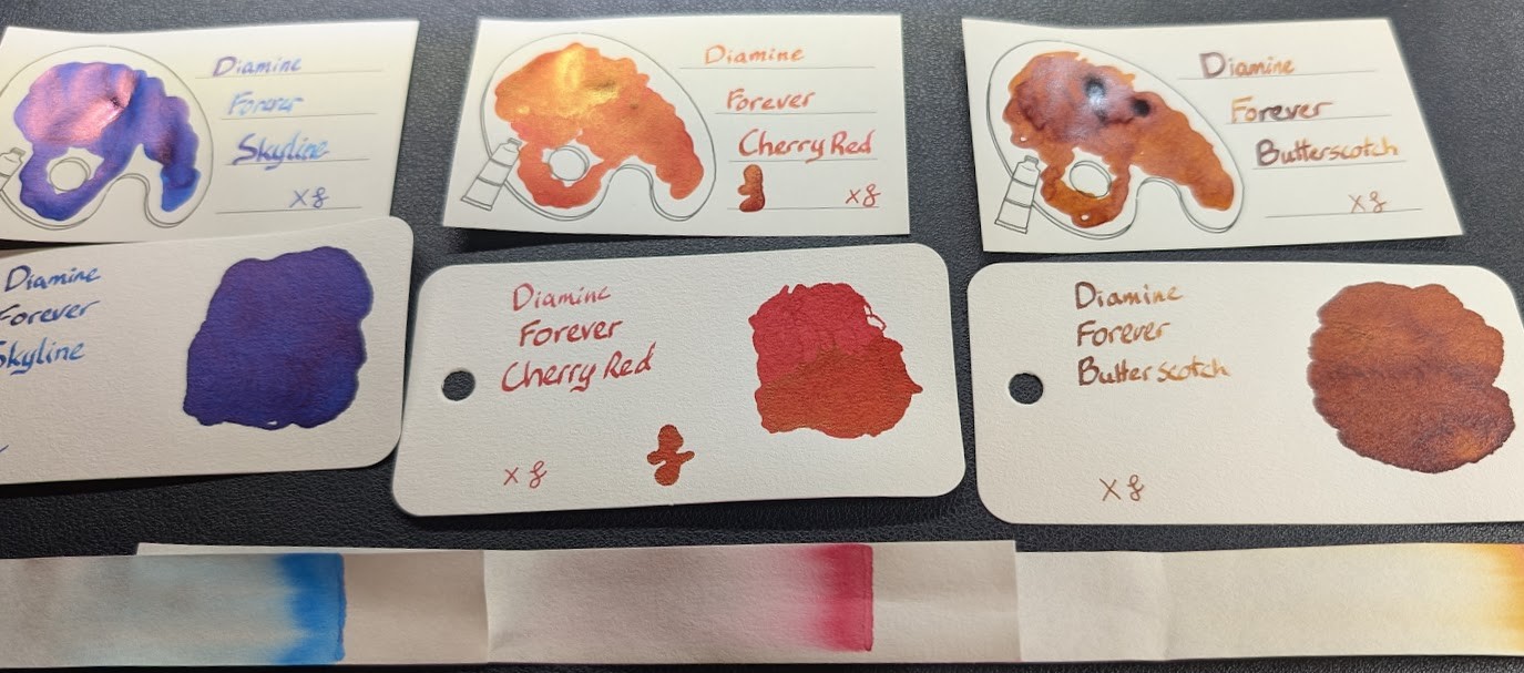 Swatches and chromatography strips for my Diamine Forever pigment/WR inks.
