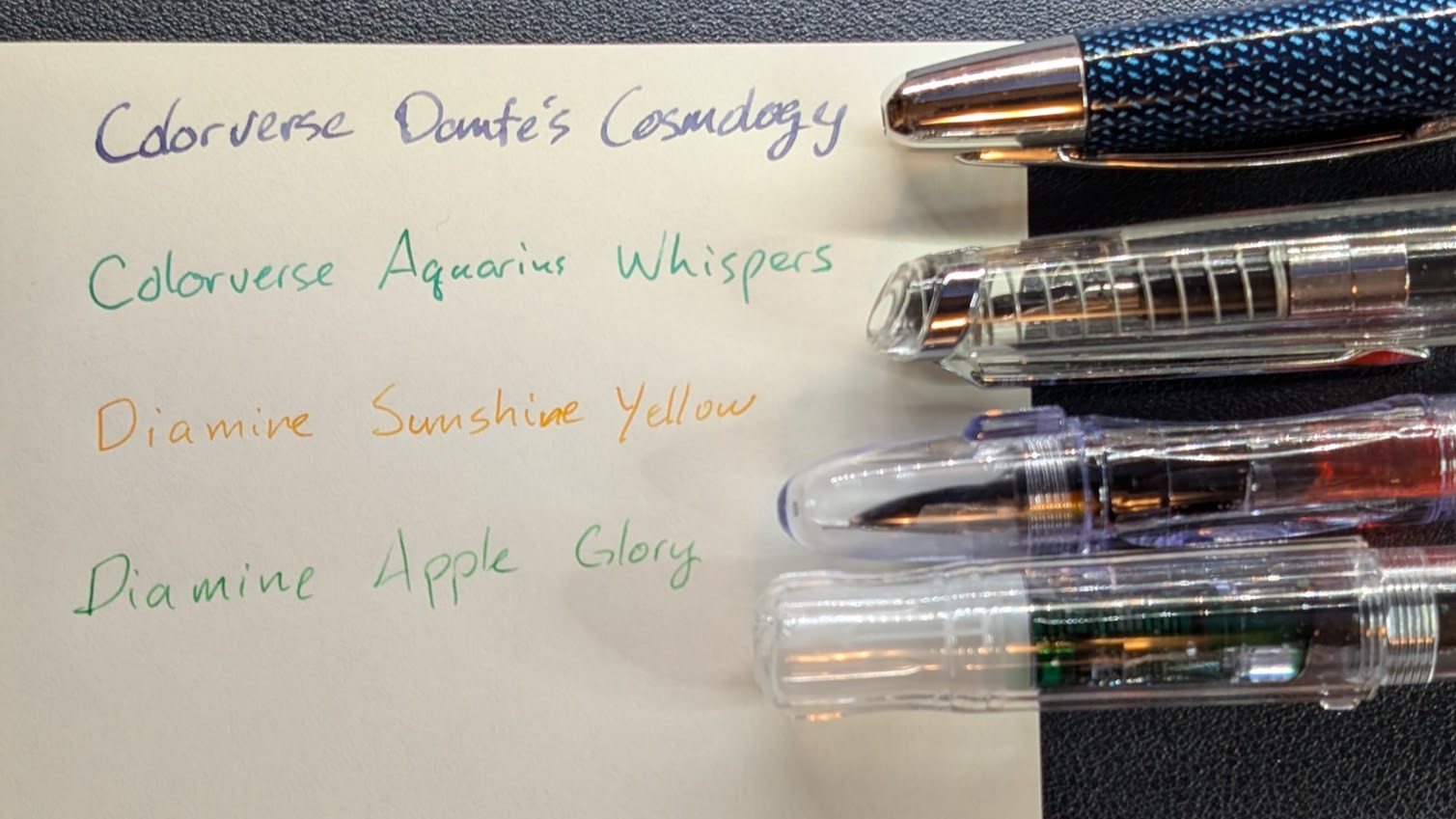 Re-inked two of the pens with different colors (VP and Phantom), and two with what they had before (Penmanship and Kakuno). I need to use the Colorverse inks more often.