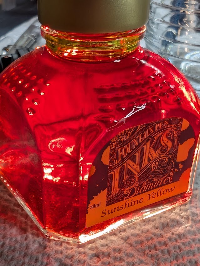 Snapped this earlier when I had the bottle out to fill a pen. Most inks are so opaque you can't see much going on in the bottle, but Diamine Sunshine Yellow is very much the opposite. To-ro is similar.