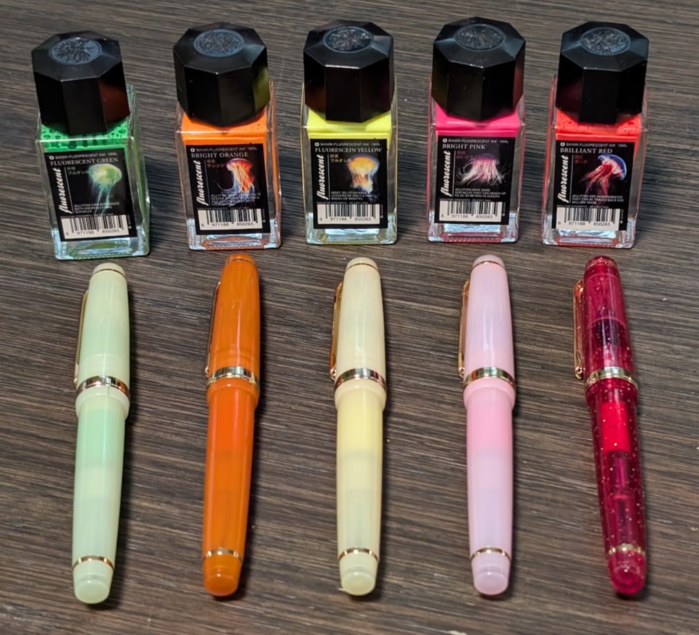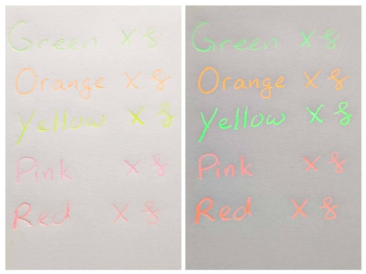 Inks R-L: Fluorescent Green, Bright Orange, Fluorescein Yellow, Bright Pink, Brilliant Red