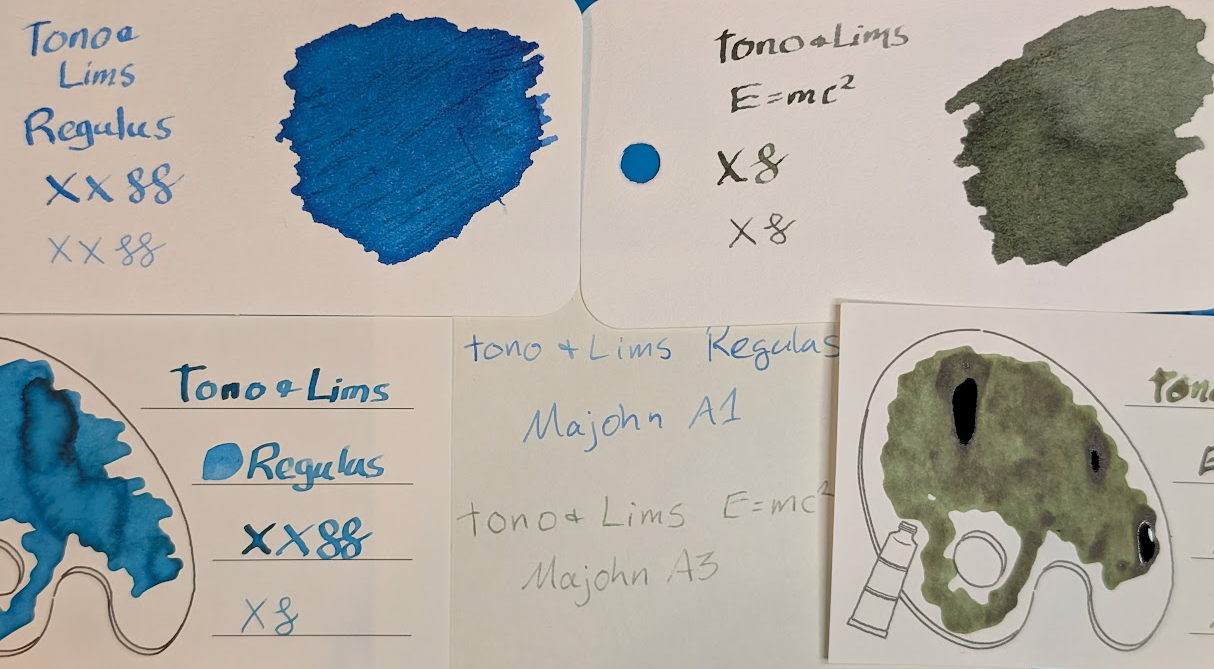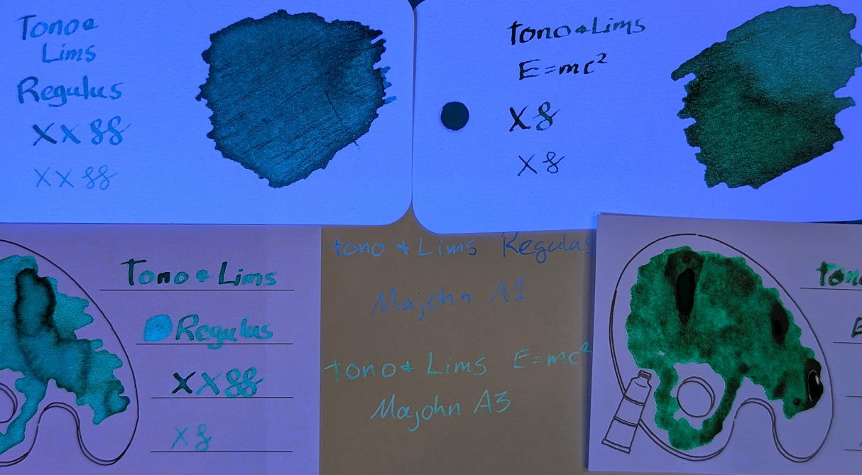 First two images have both inks on Col-o-ring, Iroful (paint palette card), and a Midori note block sheet. First is natural light, then UV. The difference in glow color for Regulus is significant between the different papers