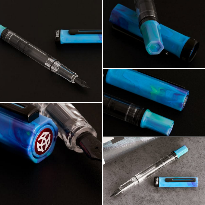 Collage of several photos of a TWSBI piston filler fountain pen. It has a transparent body, black nib, and black accents. The cap and piston knob are a swirled marble-like mix of blues and greens.