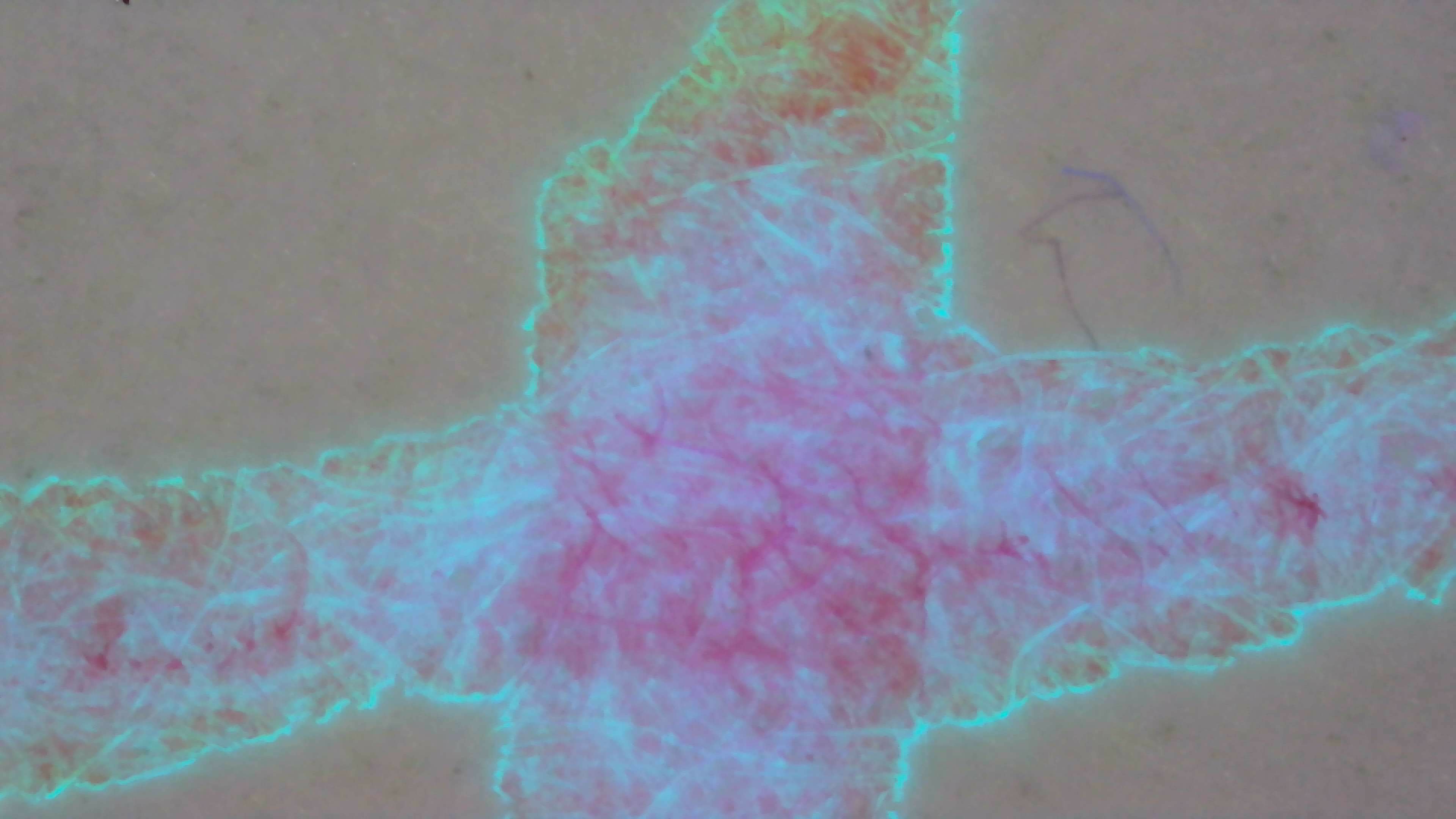 Under UV, the Midori writing shows a bit of everything. Areas of blue and purple, orange near the edge, and an outline of green.