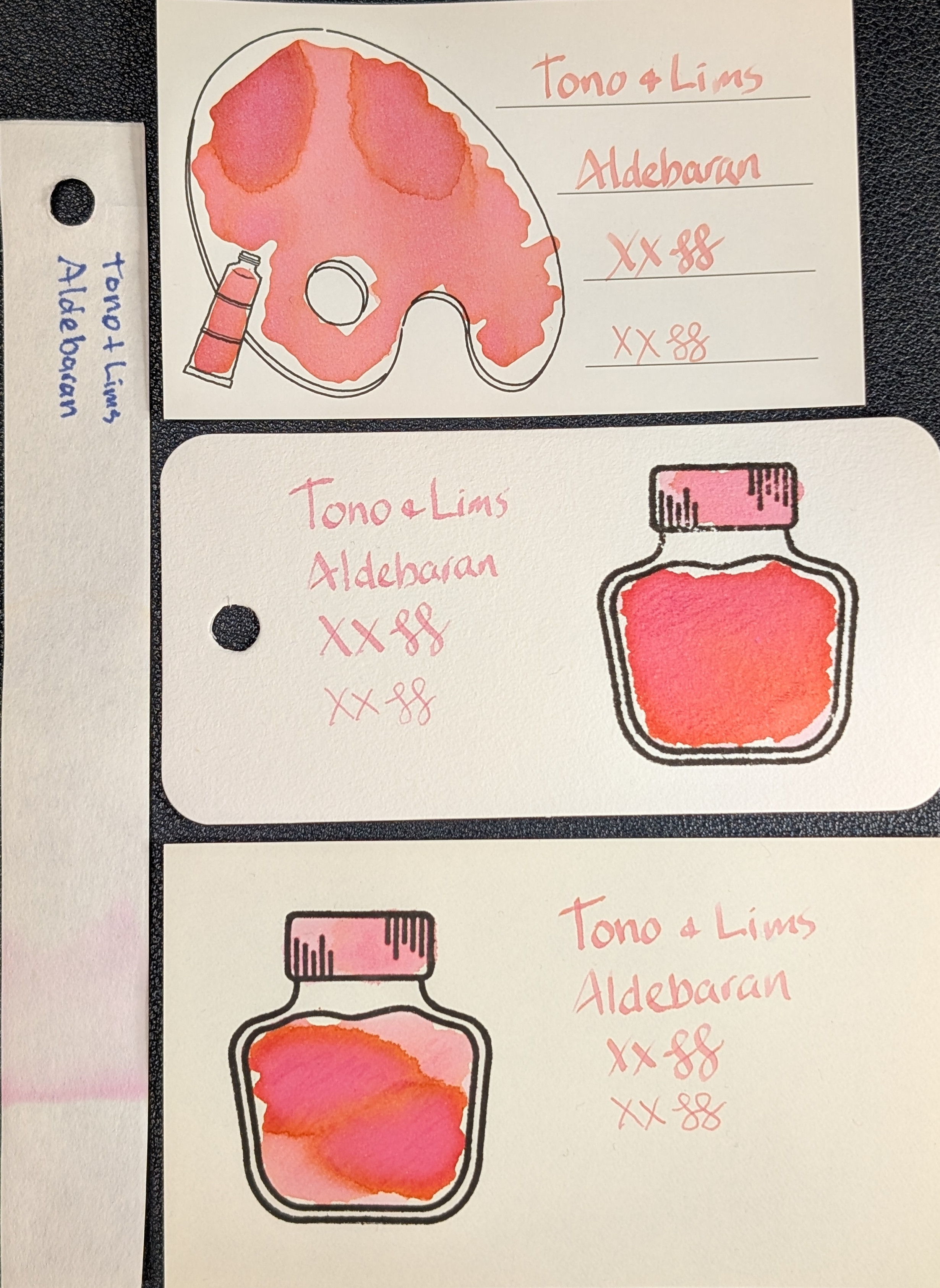 There is a lot going on, and it's wild! Base is coral but it also chromashades closer to orange and pink. On Iroful & Midori the writing is coral and light, but legible. Col-o-ring is more pink.