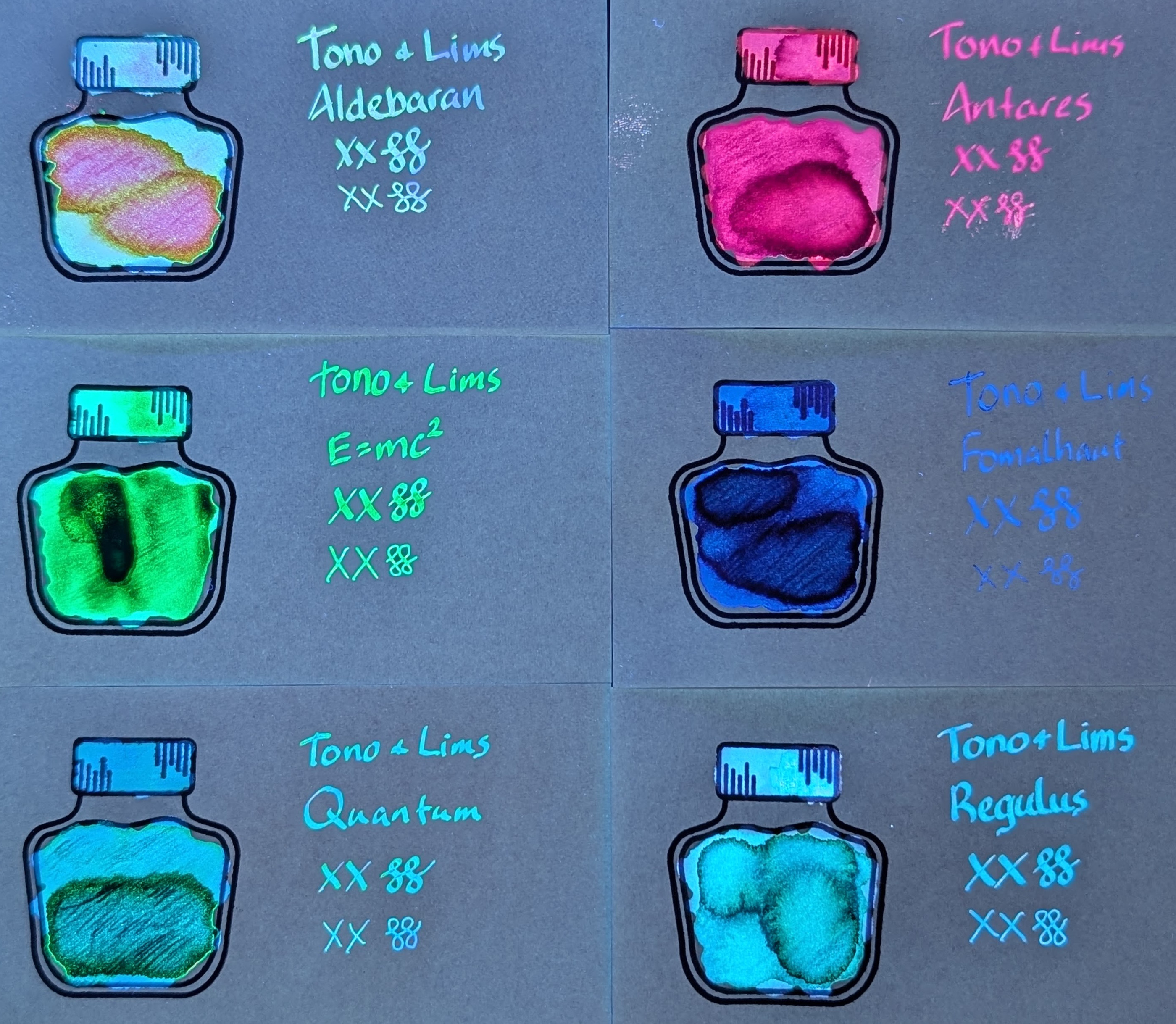 Now that I’ve posted them all, here’s a side-by-side of the Tono + Lims Star Light series fluorescent inks.